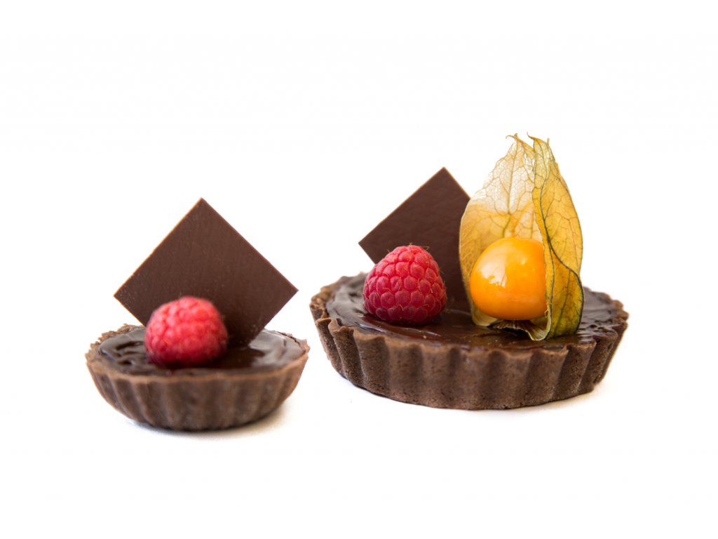 Koláč z jemného maslovo - kakaového cesta doplnený kyslými ríbezľami tak aby tvorili vyváženú chuť s nugátovo - lieskovcovým krémom, mascarpone, šľahačkou a samozrejme na vrchu nájdete tmavú - horkú čokoládu. Tart je zdobený čerstvým ovocím, kvetmi a liofizovaným ovocím.