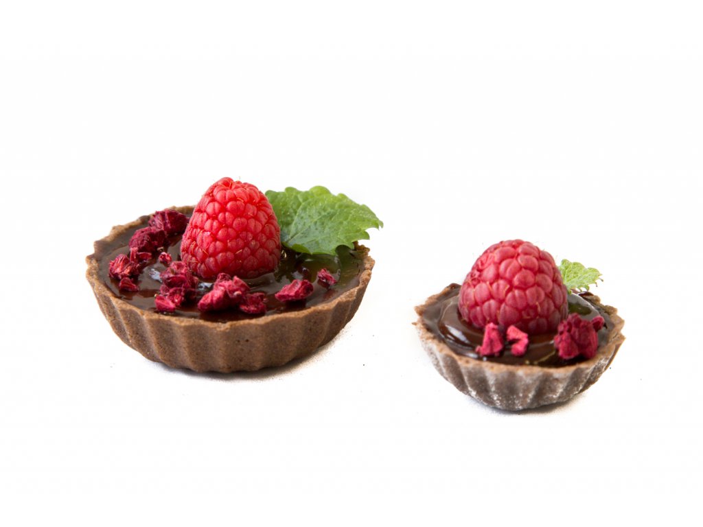 Jemné maslovo - čokoládové cesto upečené ako košíček, naplnený úžasným čokoládovým ganache. Dozdobené sezónnym ovocím.